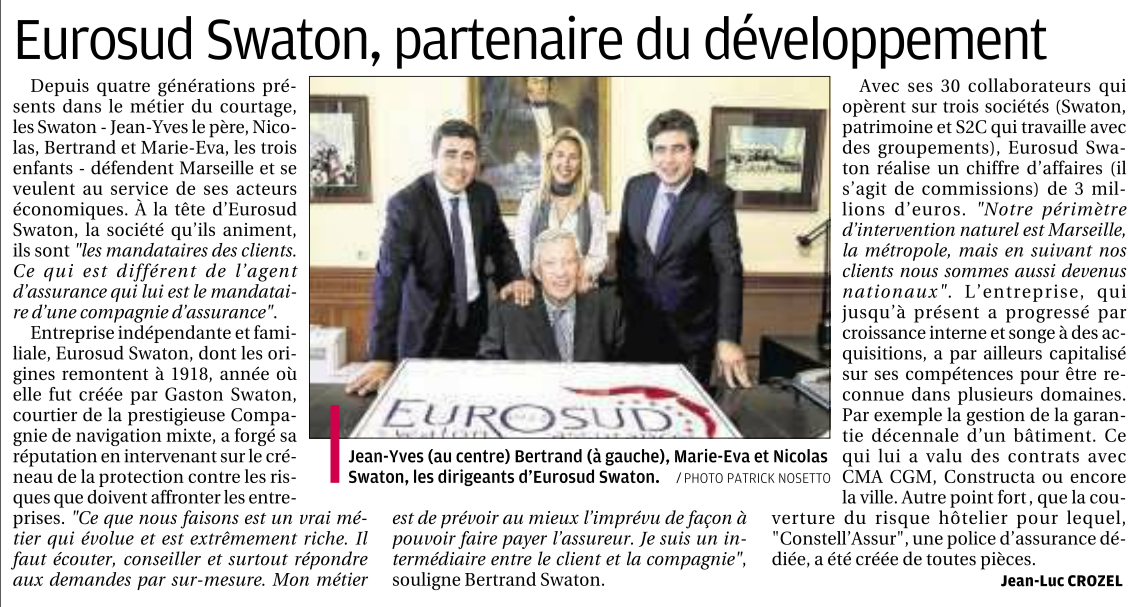 Article de Jean-Luc Crozel paru le 7 Avril 2015 dans La Provence : "...Entreprise indépendante et familiale, Eurosud Swaton, dont les origines remontent à 1918, année ou Gaston Swaton a commencé dans l'assurance, a forgé sa réputation en intervenant sur le créneau de la protection contre les risques que doivent affronter les entreprises..."