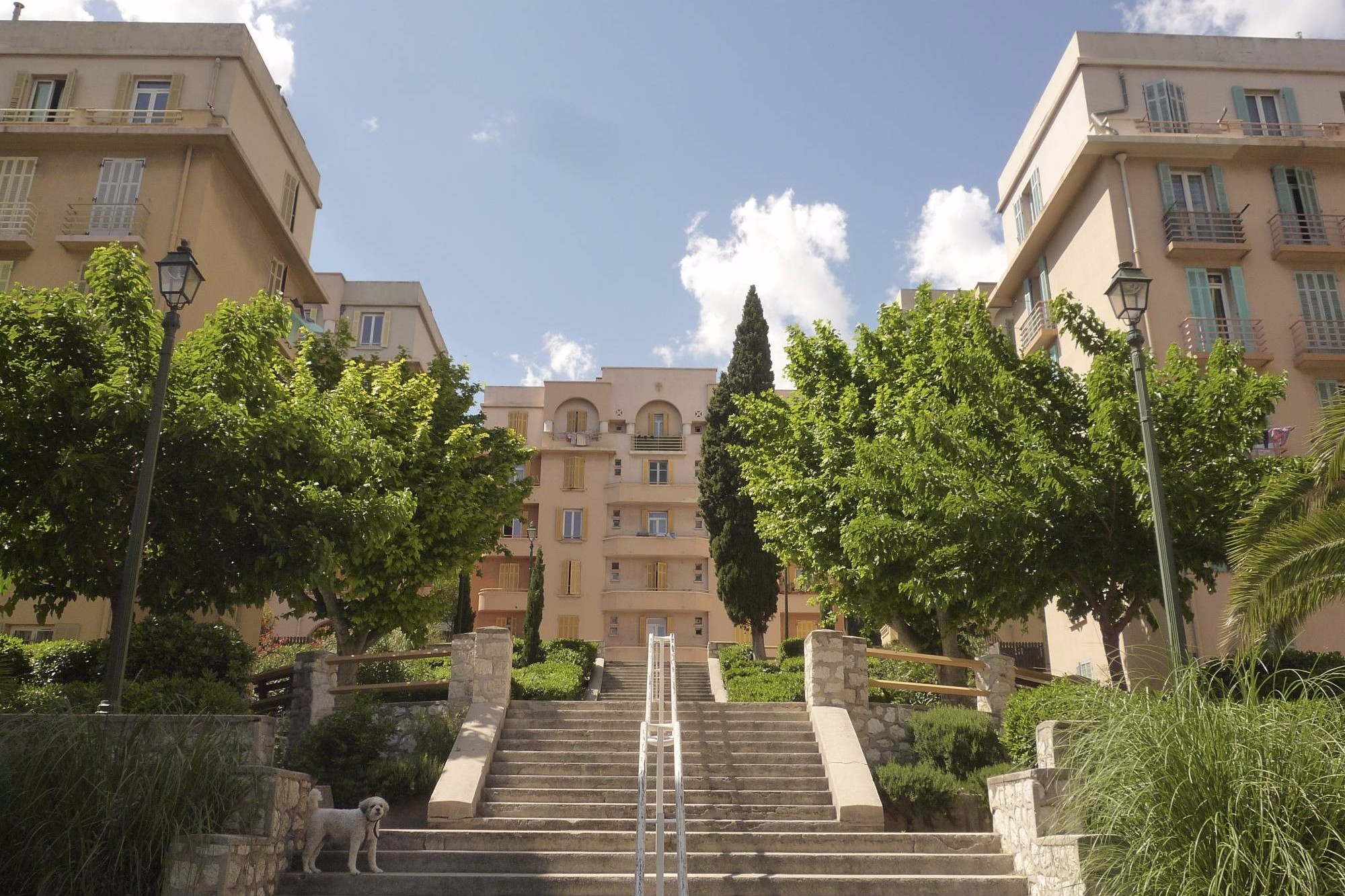 C’est dans ce contexte que l’architecte Jean Rozan, associé à André Gallerand, réalisera en 1935 la cité “Bernabo” dans les quartiers nord, à proximité des emplois du port neuf et des abattoirs : une bonne relation domicile-travail. Un total de 719 logements répartis en plots alignés sur les boulevards adjacents et deux corniches en balcon, une architecture bien dessinée, un escalier monumental pour aller à la ville, avec jardins en terrasses et bancs publics, des buissons bien taillés, une place centrale en rotonde et des voitures à l’ombre de quelque platanes de collection… une préfiguration très originale du fameux “îlot ouvert” qui fera débat 60 ans plus tard, sous la plume d’ un autre architecte : Christian de Portzamparc… Voilà qui fut un beau moment d’urbanité à flanc de colline pour donner au logement social toute la fierté qu’il mérite : la qualité d’avant-guerre !